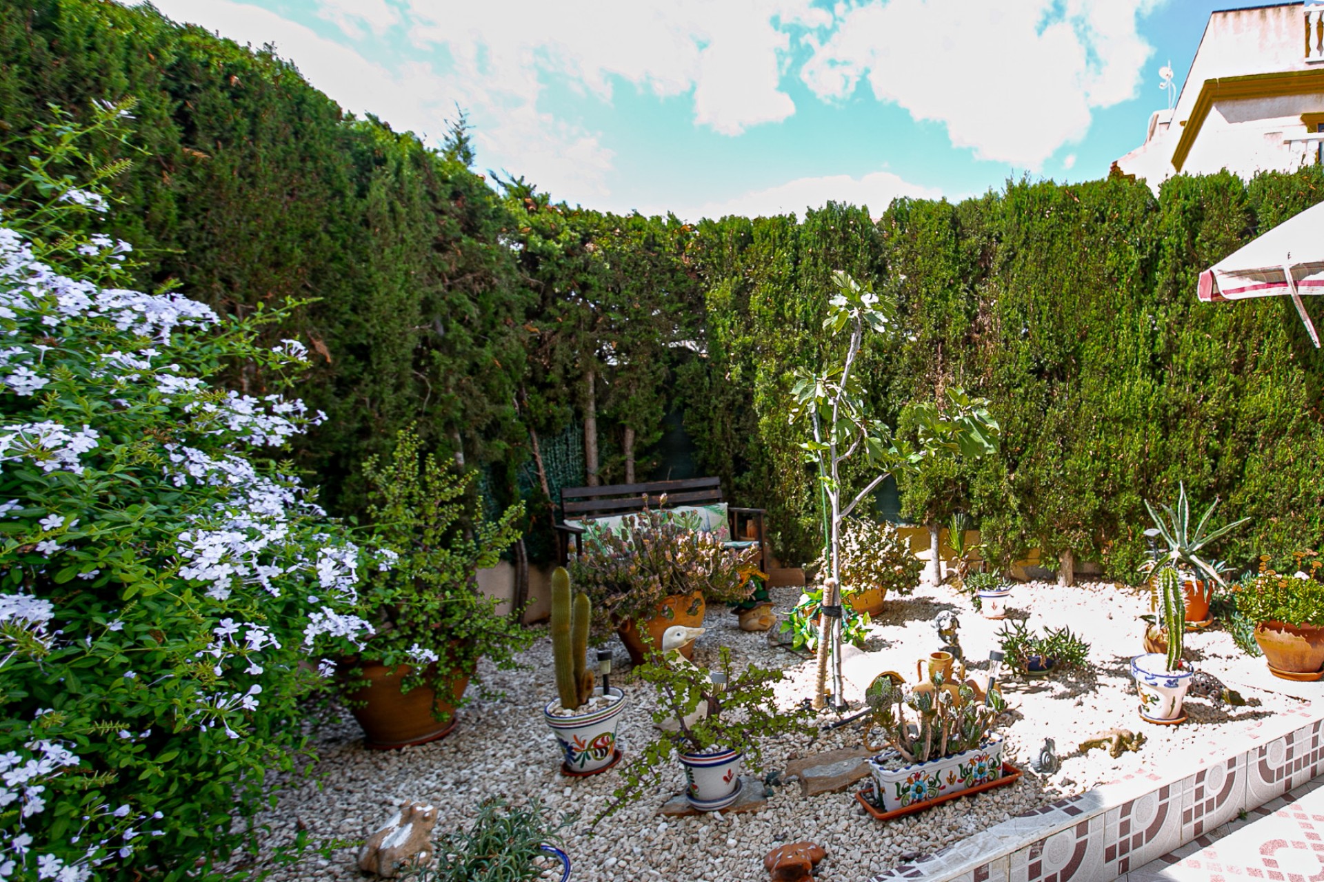 We present this charming ground floor bungalow style apartment, with the convenience of parking your car inside the plot under its practical carport. The property sits on a private semi-circular plot that surrounds the house, offering different outdoor areas to enjoy the Mediterranean climate.