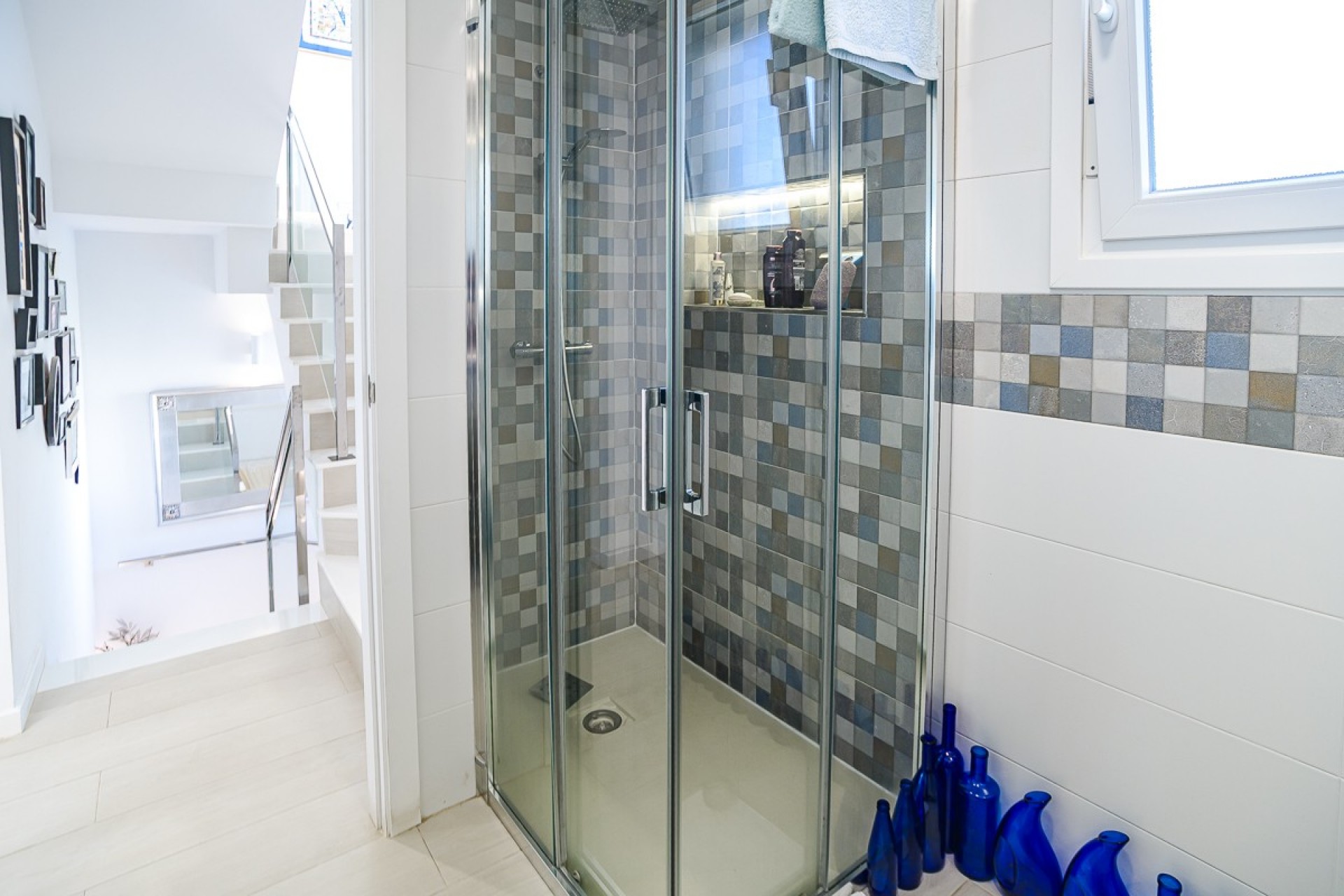 The home is finished with high-quality materials and excellent features , including built-in wardrobes, air conditioning, underfloor heating, aluminium windows with Climalit glazing, wooden interior doors, and stylish stoneware floors .