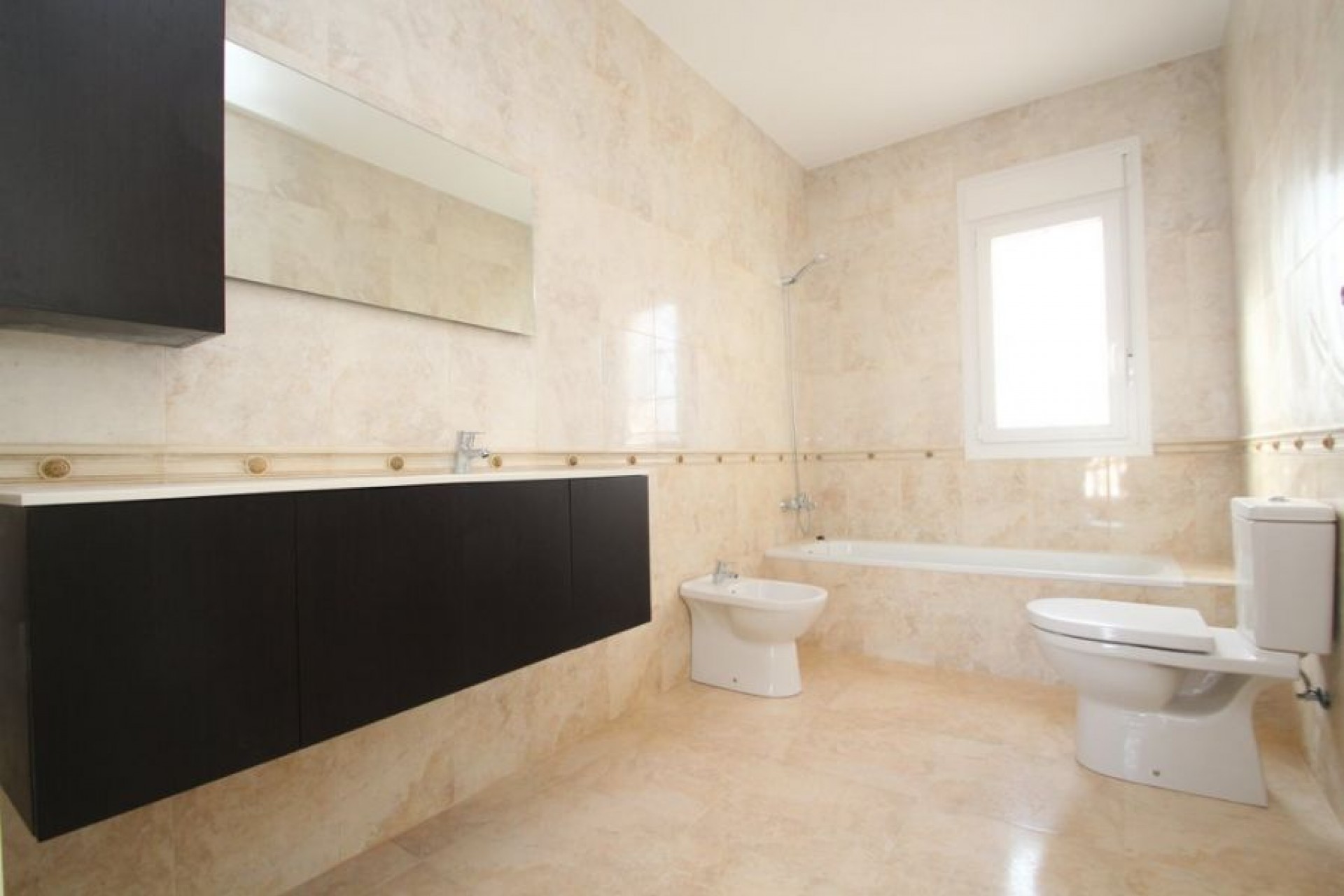 Cabo Roig, Detached villa to new brand with 520 mts of plot and a housing in 2 heights plus solarium of 220 mts, 4 bedrooms of which 1 is on the ground floor and 3 have their bathroom en suite and with terrace, 4 bathrooms all With underfloor heating and 1 toilet, large living room with fireplace, equipped semi-independent kitchen, private pool (9x4), air conditioning, 300 meters from the beach.