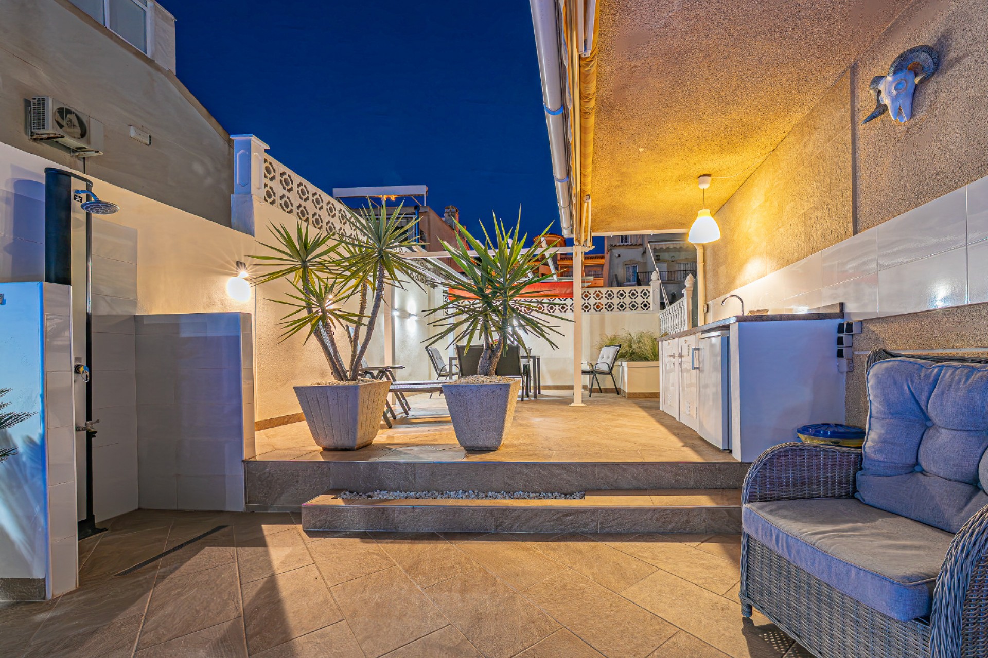 The upper floor features a bright and inviting lounge and dining area, a fully equipped kitchen, two spacious double bedrooms, and two modern bathrooms. From the lounge, step directly onto your private roof terrace, complete with a pergola – the perfect spot to unwind on warm Mediterranean evenings. A glazed balcony/conservatory adds to the living space, ideal for relaxing with a book or enjoying morning coffee year-round.Lower Level – Independent Guest Apartment with Garden Access