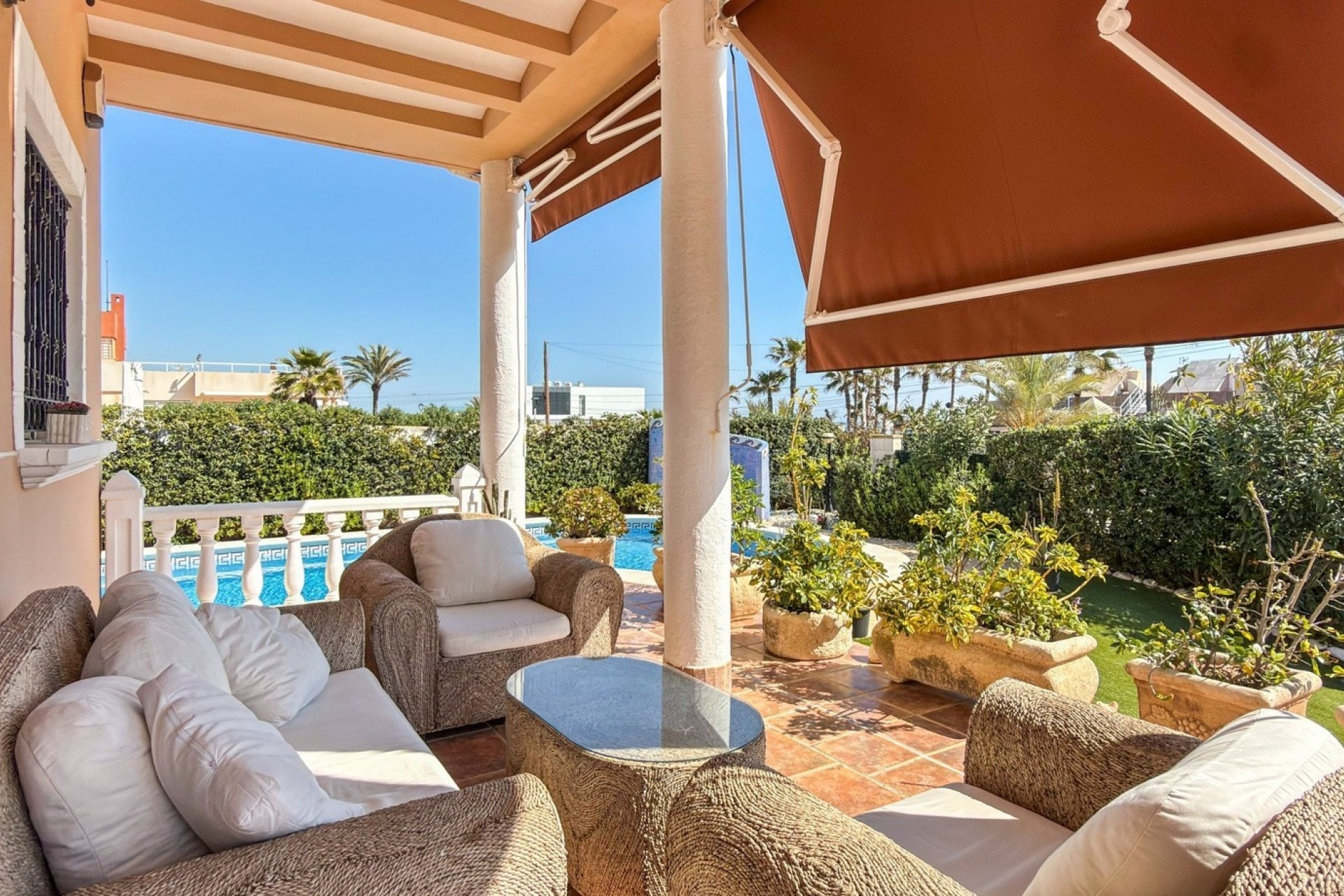 El exterior es uno de los grandes atractivos de la propiedad. Una impresionante piscina privada rodeada de un cuidado jardín ofrece un entorno tranquilo y exclusivo para disfrutar del sol mediterráneo. Además, cuenta con un acogedor porche y pérgola con barbacoa, perfecta para momentos inolvidables.
