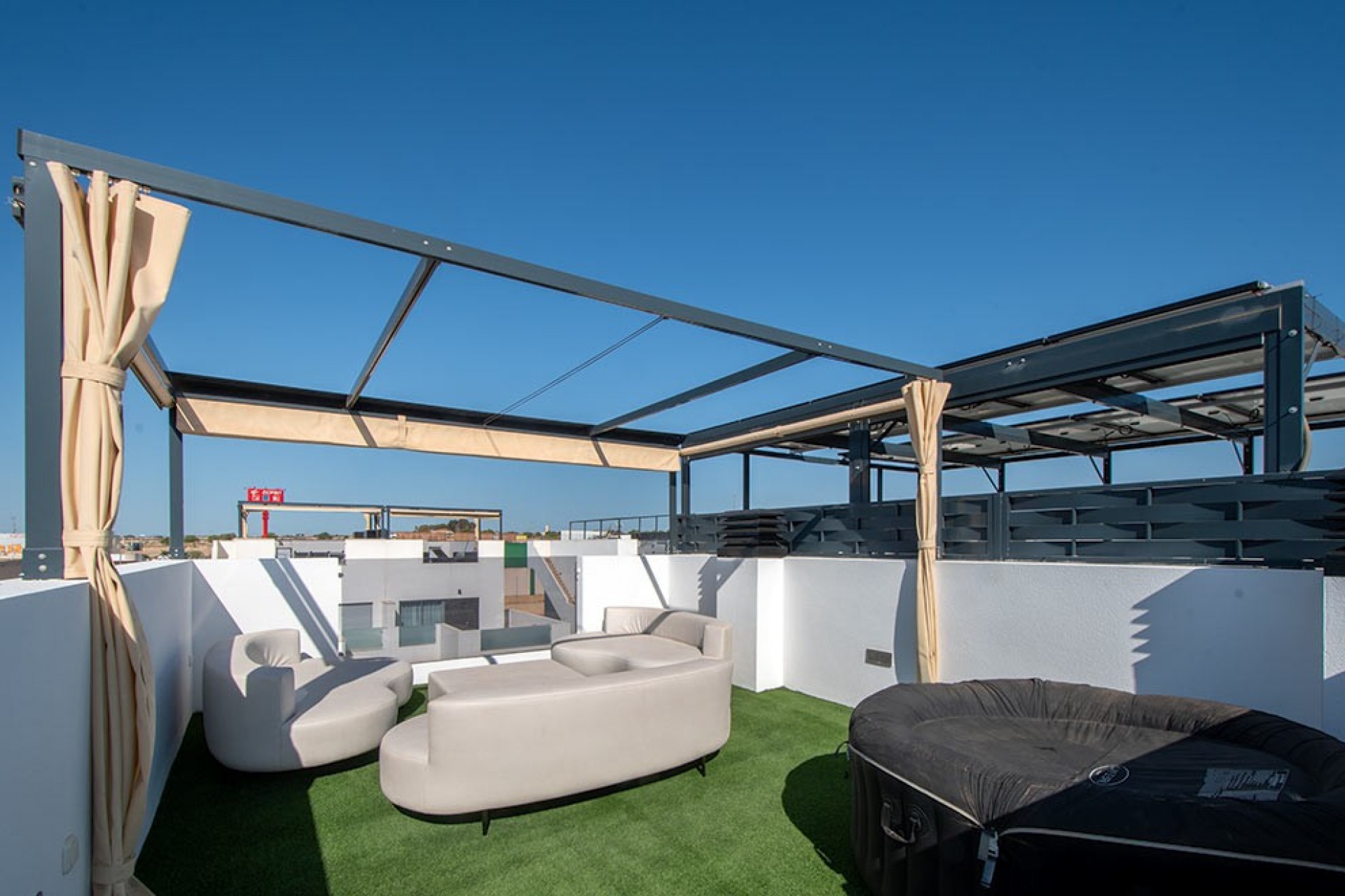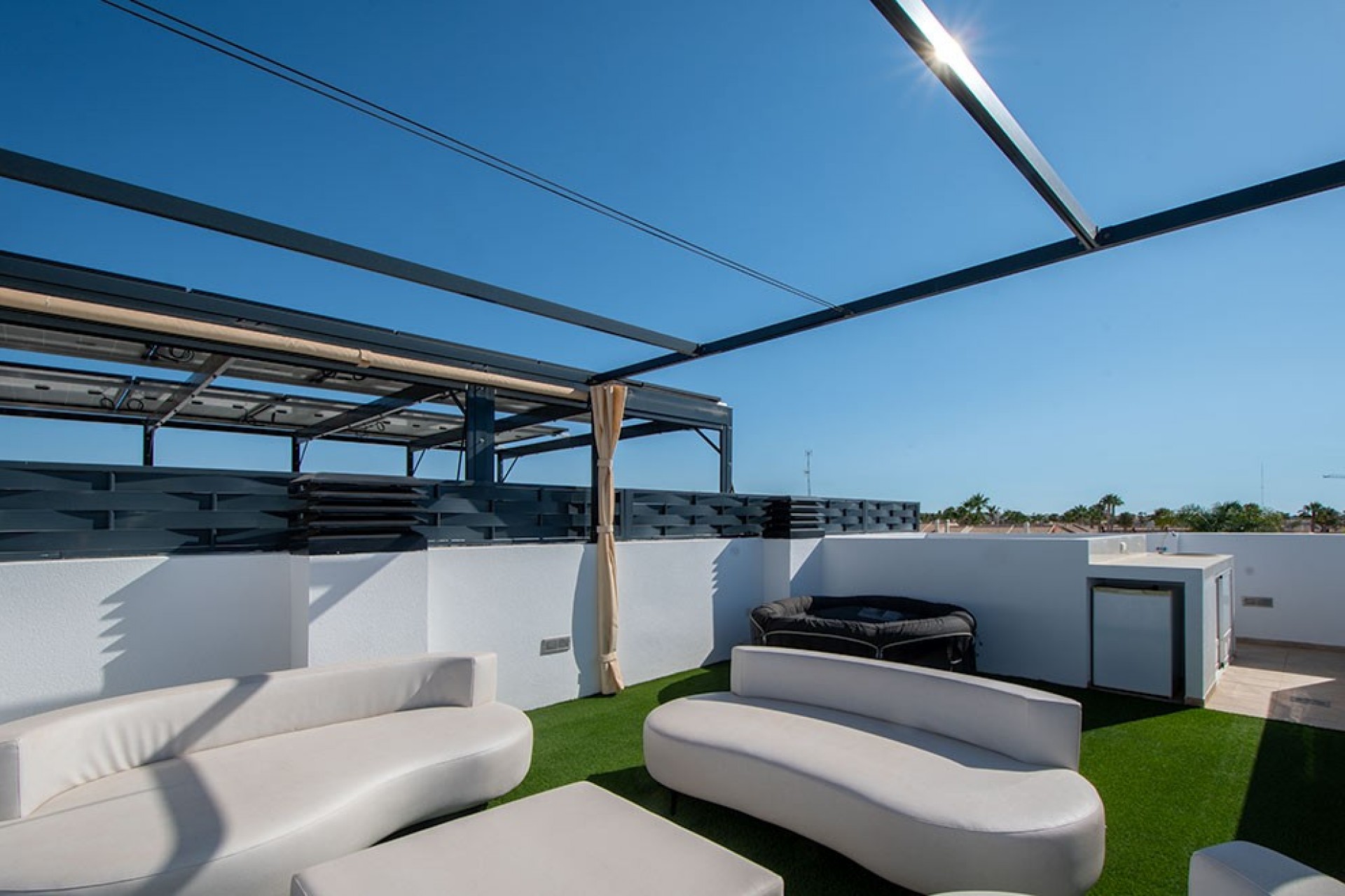 Hermosa villa adosada de dos plantas más solárium, con 3 dormitorios, 2 baños (uno en suite) y un aseo de invitados. La amplia y luminosa sala de estar combina la cocina, el comedor y el salón en un solo espacio, que se abre a una terraza con piscina privada orientada al suroeste. El dormitorio principal con baño en suite se encuentra en la planta baja, y los 2 dormitorios restantes y el baño compartido se encuentran en la planta alta. La amplia terraza de la planta alta da acceso al solárium, un lugar perfecto para disfrutar del clima de la Costa Blanca, con una zona relax con césped artificial y cubierta con una pérgola, y una cocina de verano.