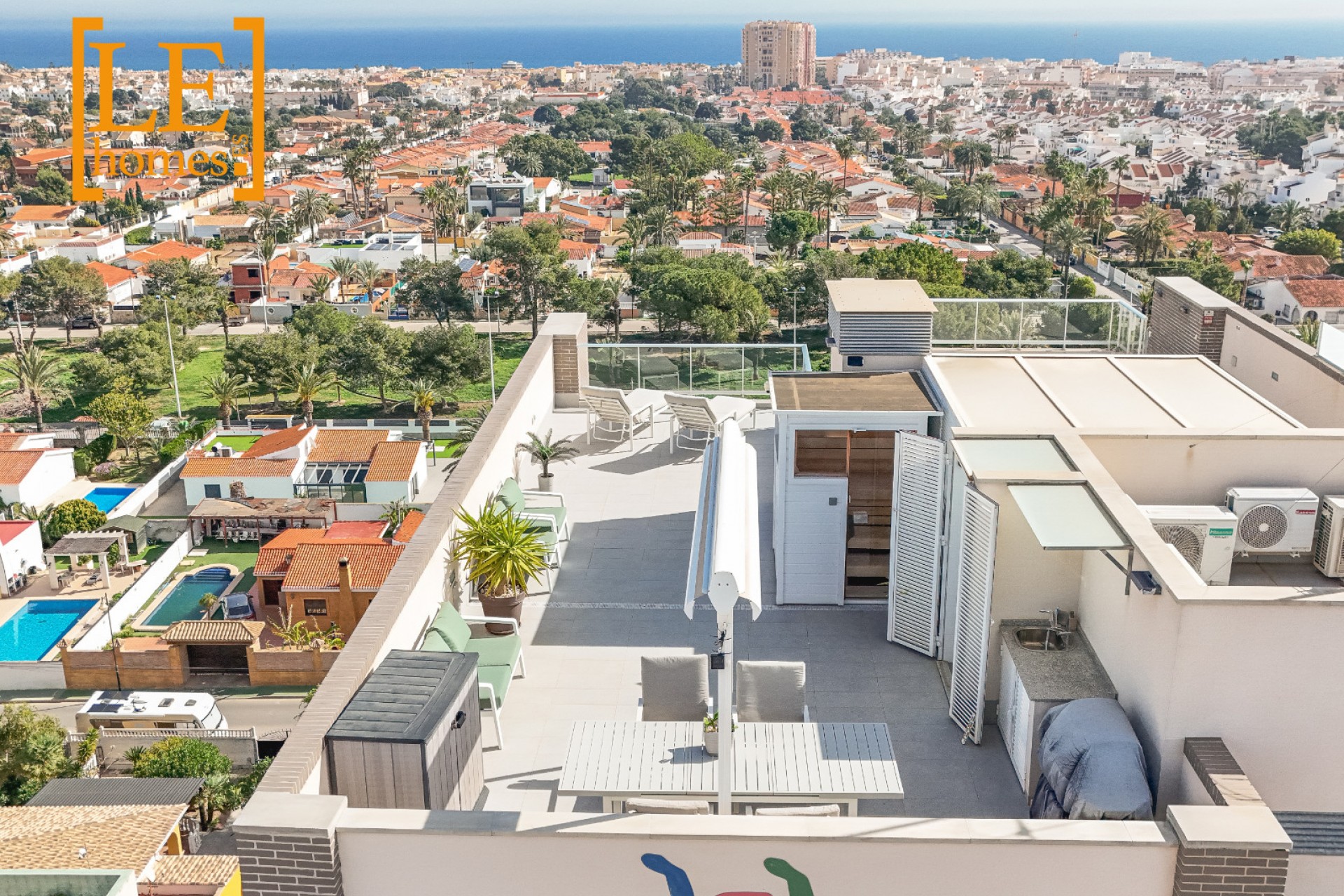 Lägenheten har två rymliga sovrum med integrerade garderober, två moderna badrum, ett rymligt vardagsrum med modernt kök och matplats, samt stora altandörrar till en balkong med panoramautsikt över omgivningarna. Från balkongen finns trappor till solariet som täcker hela lägenheten, vilket är en utmärkt plats att sola, grilla och njuta av medelhavsklimatet. Takterrassen har också en finsk bastu och en täckt dusch. Takterrassen har fantastisk utsikt i väster, där du kan se Torreviejas rosa saltsjö, i norr mot La Mata och i öster mot Medelhavet.
