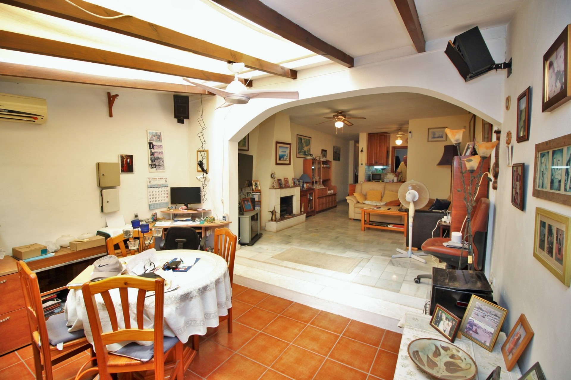 Bottenvåningen består av ett stort vardagsrum/matsal med öppet kök, 1 dubbelrum med inbyggda garderober och ett familjebadrum med duschkabin. På baksidan av fastigheten kan du nå trädgården på baksidan. På övervåningen finns ytterligare 2 sovrum och ett badrum med duschkabin. Det stora sovrummet på övervåningen har en privat balkong i söderläge med utsikt mot de gemensamma poolerna. Fastigheten utgör en del av ett samhälle med användning av flera gemensamma pooler i närheten.