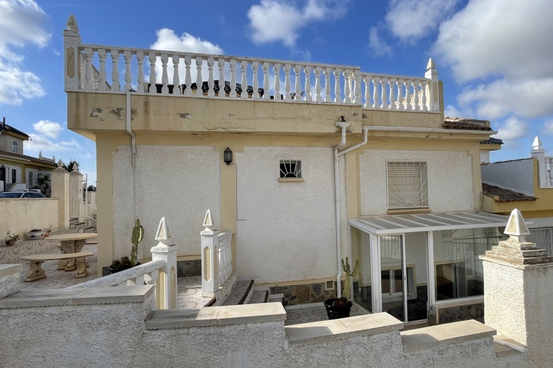 Ljust och rymligt radhus med 3 sovrum i Ciudad Quesada – Uteplats runtomkring och utsikt över golfbananUpptäck detta vackert presenterade radhus med 3 sovrum och 2 badrum i det eftertraktade området Ciudad Quesada, som erbjuder generöst utomhusutrymme, mångsidigt boende och fantastisk utsikt över La Marquesa golfbana.Fastigheten har en uteplats runtomkring och en inglasad veranda, perfekt för året runt-njutning. På nedervåningen finns en rymlig källare med ett stort sovrum med dubbelsäng och ett eget duschrum – perfekt för gäster eller den utökade familjen.Bostadsvåningen har ett ljust vardagsrum och ett välutrustat kök, tillsammans med två sovrum med inbyggda garderober och takfläktar, plus ett familjebadrum. Från vardagsrummet kommer du ut till en charmig innergård med uteplats, helt inglasad i väggar för avskildhet och värme – perfekt för mysiga vinterkvällar. En trappa leder upp till ett stort solrum där du kan njuta av panoramautsikt över golfbanan och den omgivande landsbygden. Detta hem ligger bara 5 minuters promenad från lokala bekvämligheter och erbjuder den perfekta blandningen av komfort, bekvämlighet och livsstil. Kontakta oss idag för att boka en visning eller begära en virtuell rundtur!
