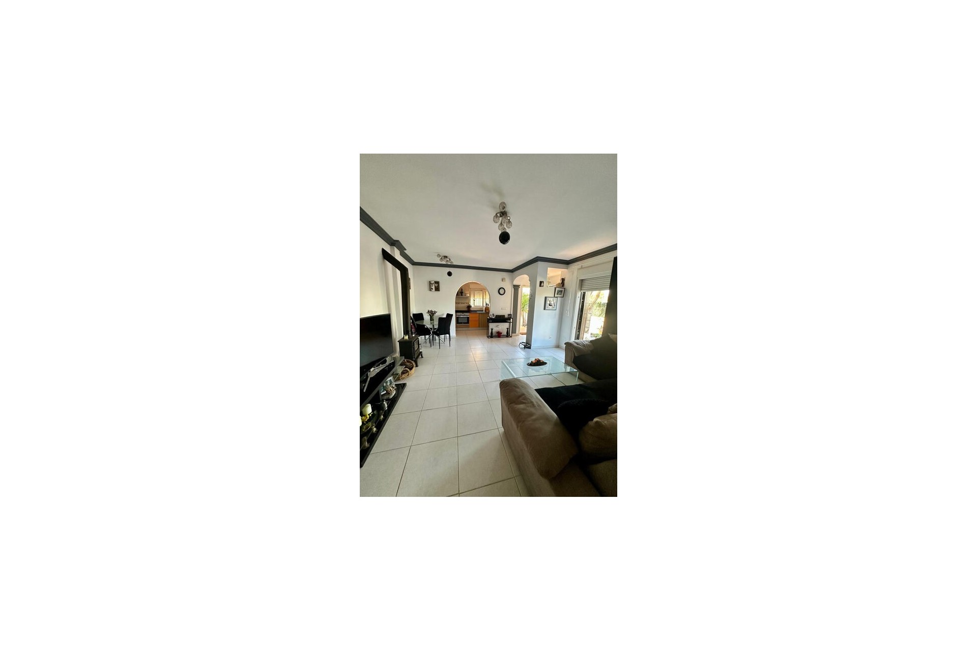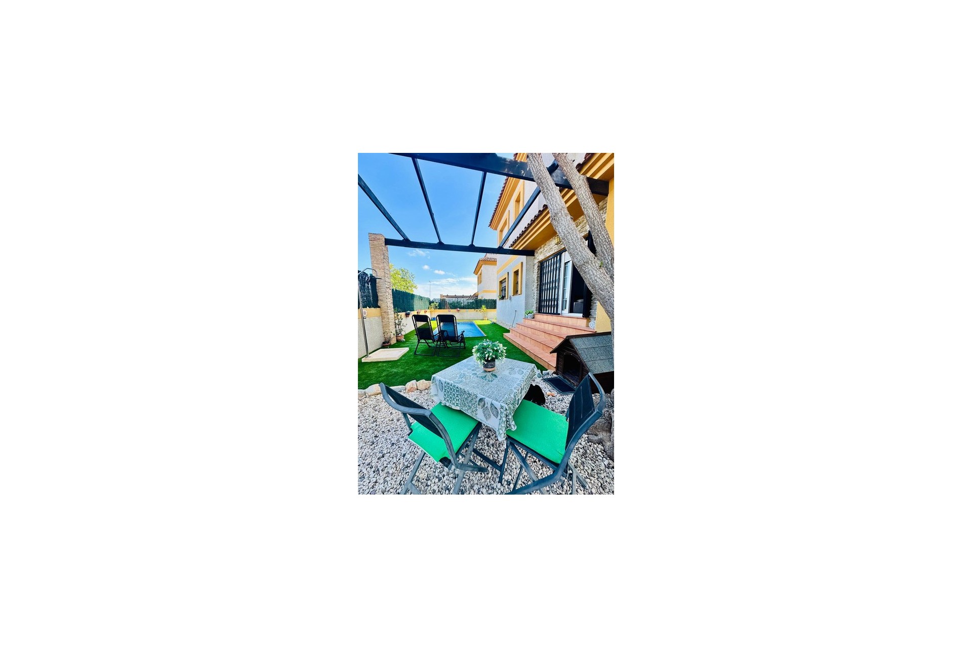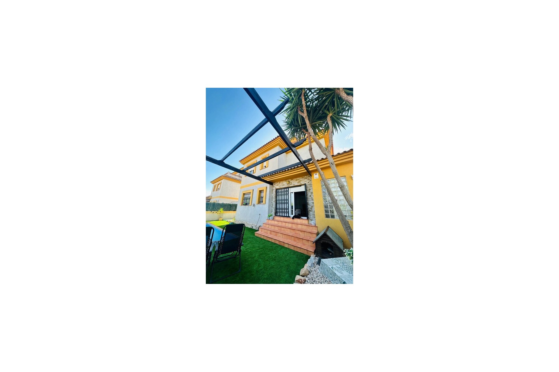 Bottenvåningen presenterar ett härligt öppet och rymligt vardagsrum med öppen spis och altandörr till poolområdet. Fullt utrustat modernt kök separerat av en valvbåge. Dubbelrum med unik klädkammare som fungerar som en rolig barnhörna eller extra förvaring. Badrum på bottenvåningen med dusch. En ljus trappa tar dig till första våningen med ett familjebadrum, sovrum med inbyggda garderober och sovrum med inbyggda garderober och altandörrar till den privata terrassen. Interna trappor leder från denna våning upp till solterrassen, perfekt för att njuta av vintersolen och den vidsträckta utsikten. Ett urval av restauranger/barer och en stormarknad ligger bara 2 minuters promenad bort, med stränder, köpcentra och Alicantes flygplats inom bekvämt bilavstånd. Fastigheten säljs delvis möblerad med luftkonditionering i hela huset.